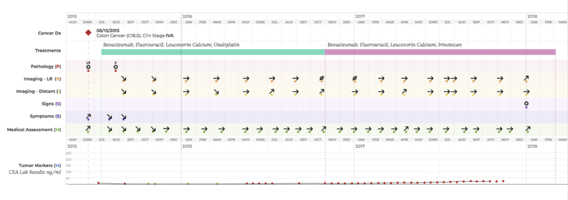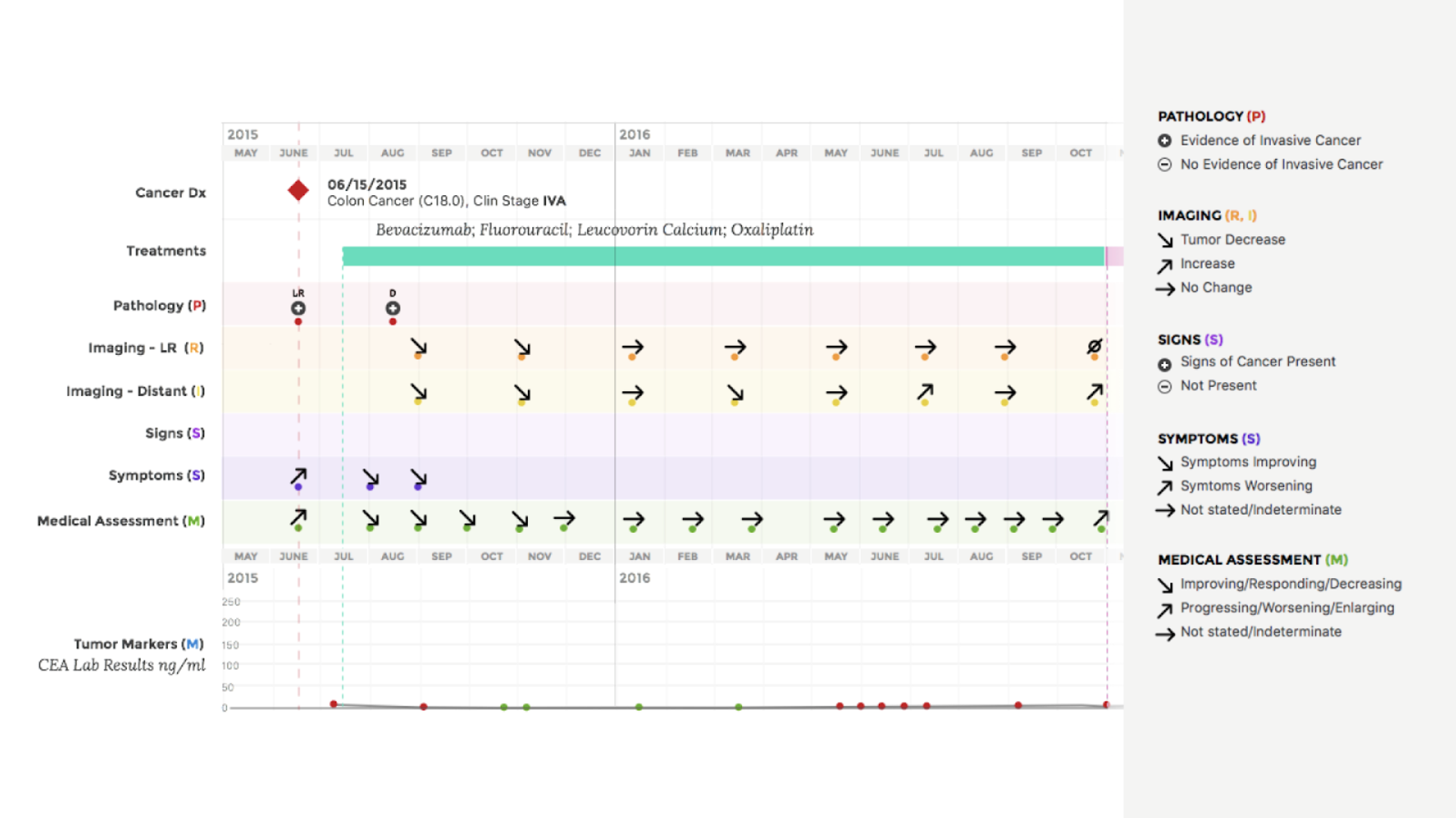 With this visual, a doctor can understand a patient’s treatment timeline in minutes—saving significant time compared to searching through raw EHR records.