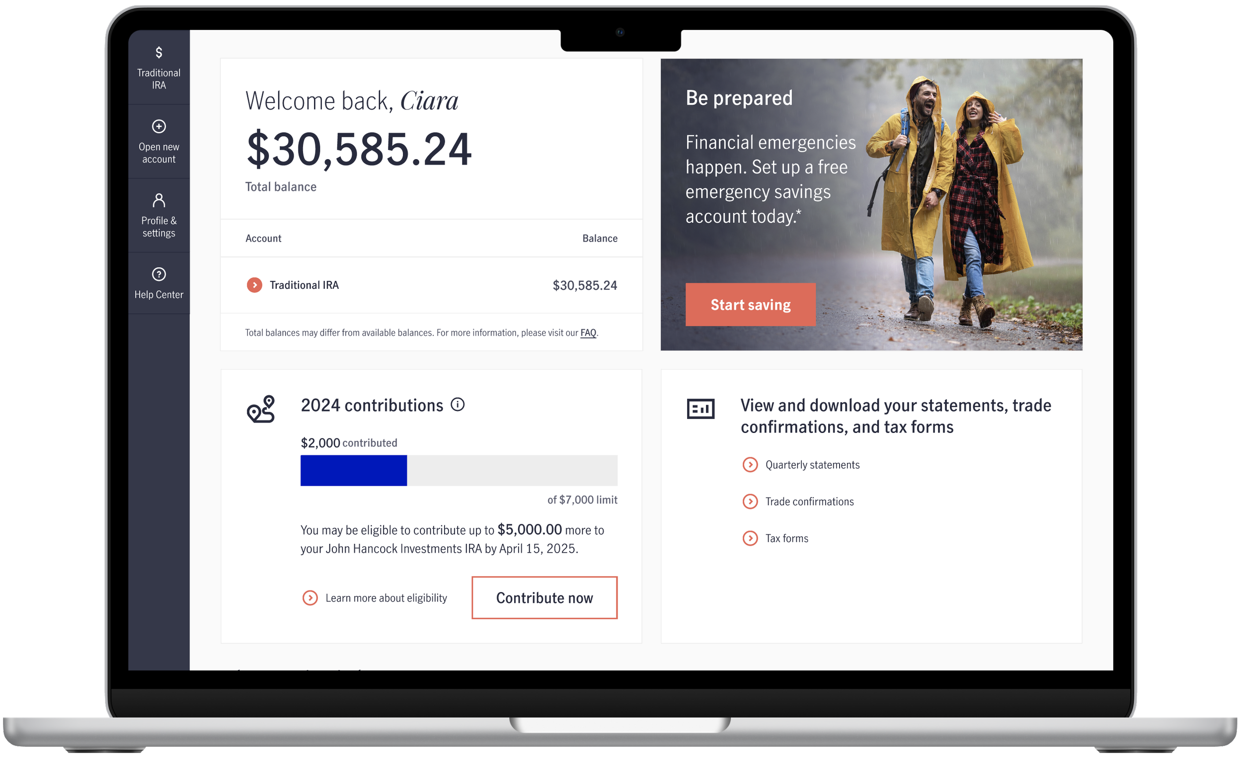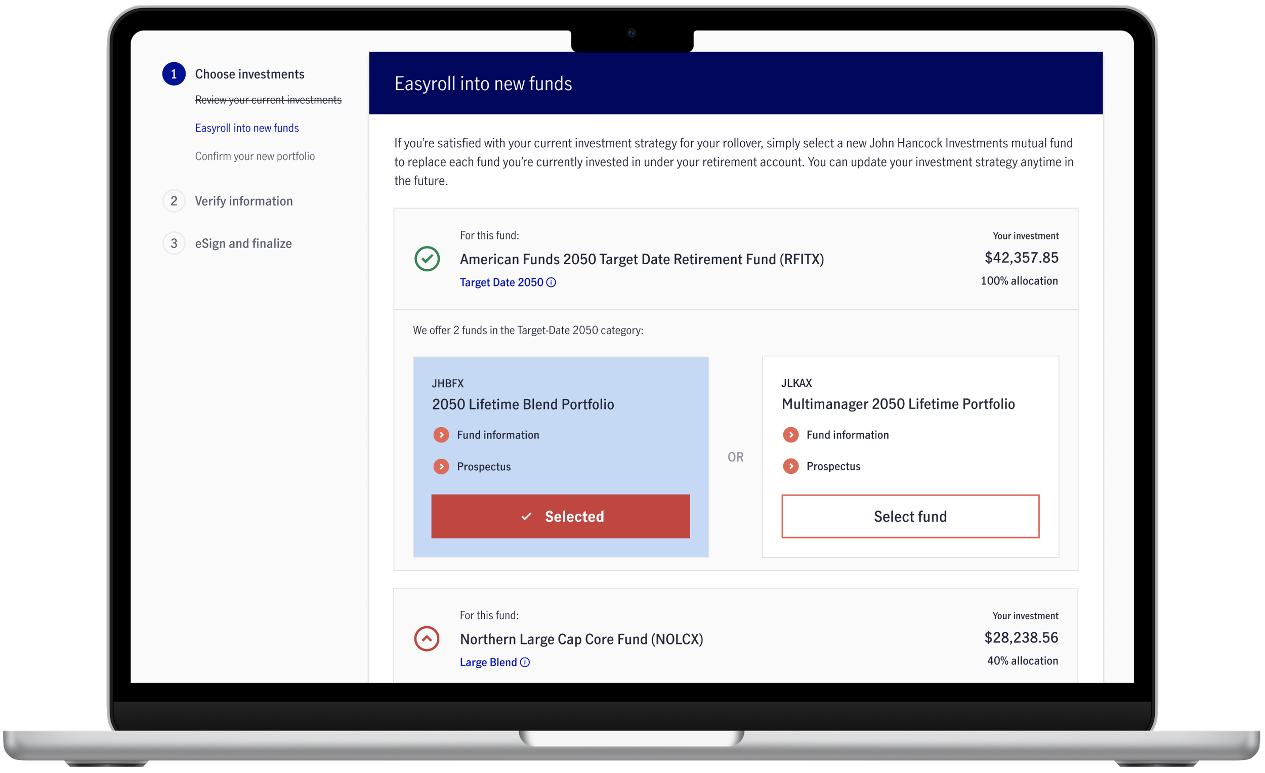 Created educational content for the retirement portal that helped users understand rollover options after leaving a job—widening the top of the funnel and reducing reliance on support. Led the redesign of the digital flow, introducing EasyRoll, which auto-matched users’ 401(k) holdings to JH funds—removing a key abandonment point.Designing a New IRA Platform (Brokerage Model):